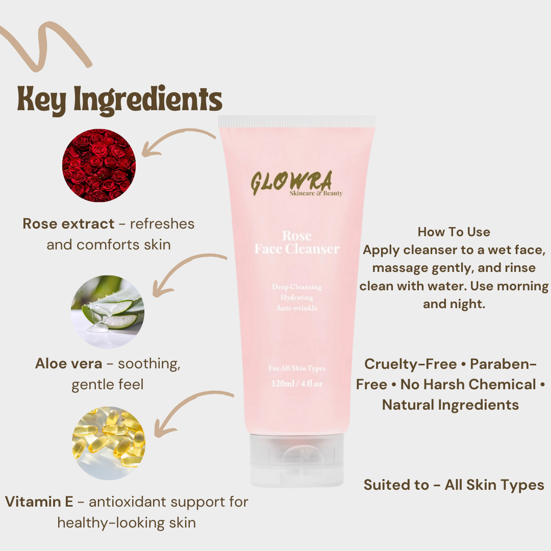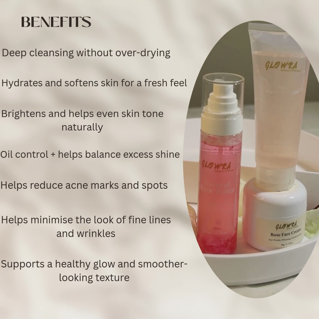 Indulge in a complete daily ritual with the Glowra Rose Skincare Set, designed to cleanse, tone, and deeply nourish your skin.