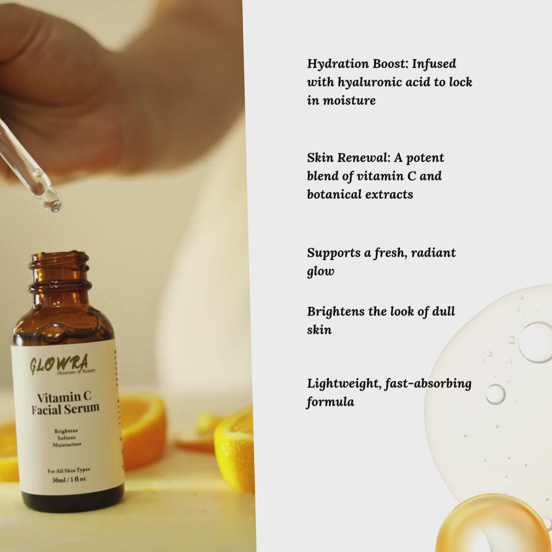 Unveil a luminous complexion with Glowra Vitamin C Serum. A brightening serum enriched with Vitamin C and E, and Hyaluronic Acid, jojoba oil, and seaweed extract to boost radiance and even skin tone, this serum targets dark spots, fine lines, and dullness while providing intense hydration for a radiant, youthful glow.